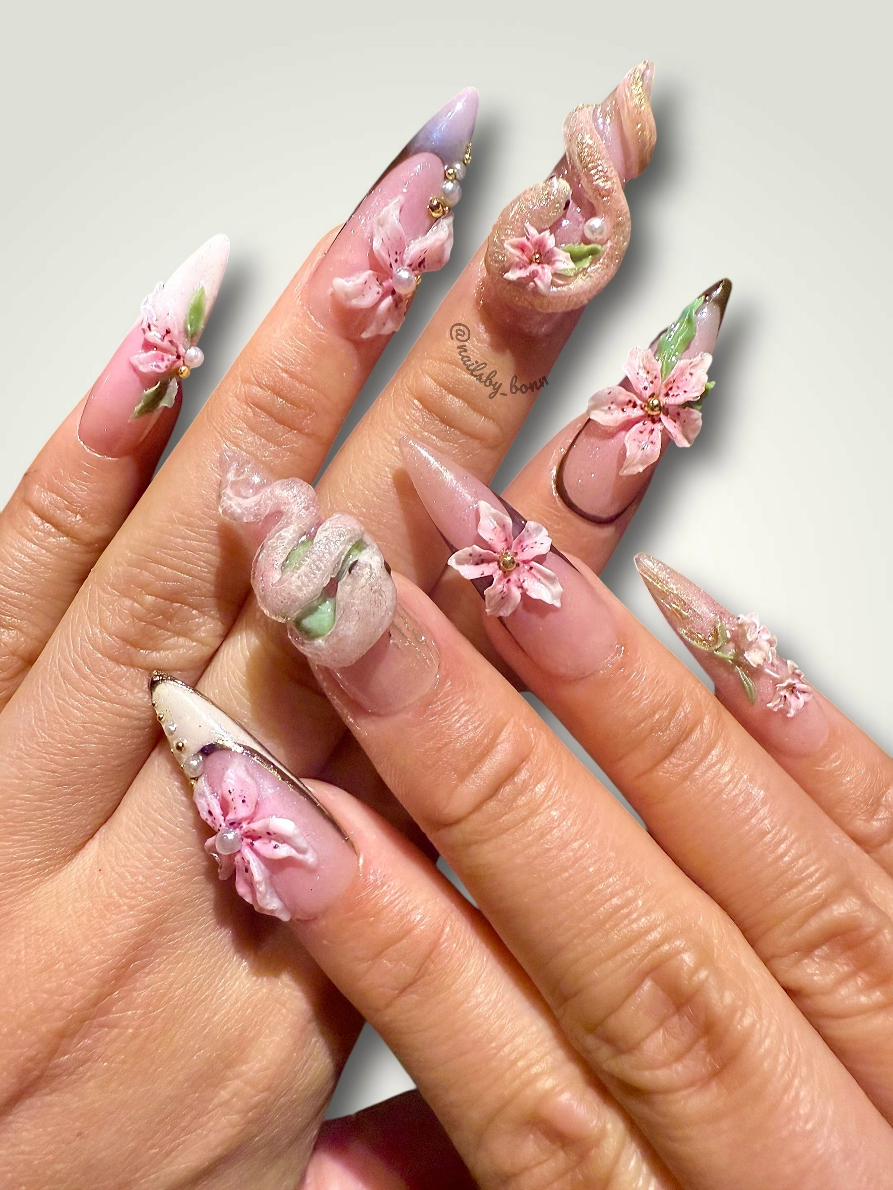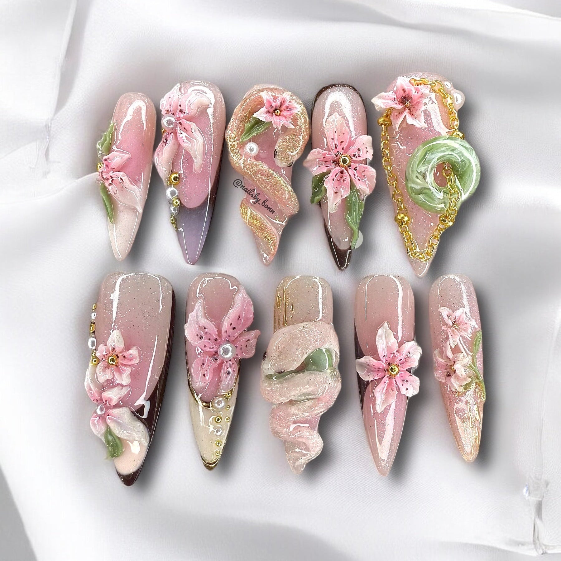 Gilded Serpent Garden is a bold fusion of elegance and edge — shimmering metallics, jewel-toned blooms, and stunning 3D serpent accents. This long stiletto set feels like a stroll through a luxurious, forbidden garden where gold glimmers and mystery thrives. Perfect for the daring babe who loves glam with bite.