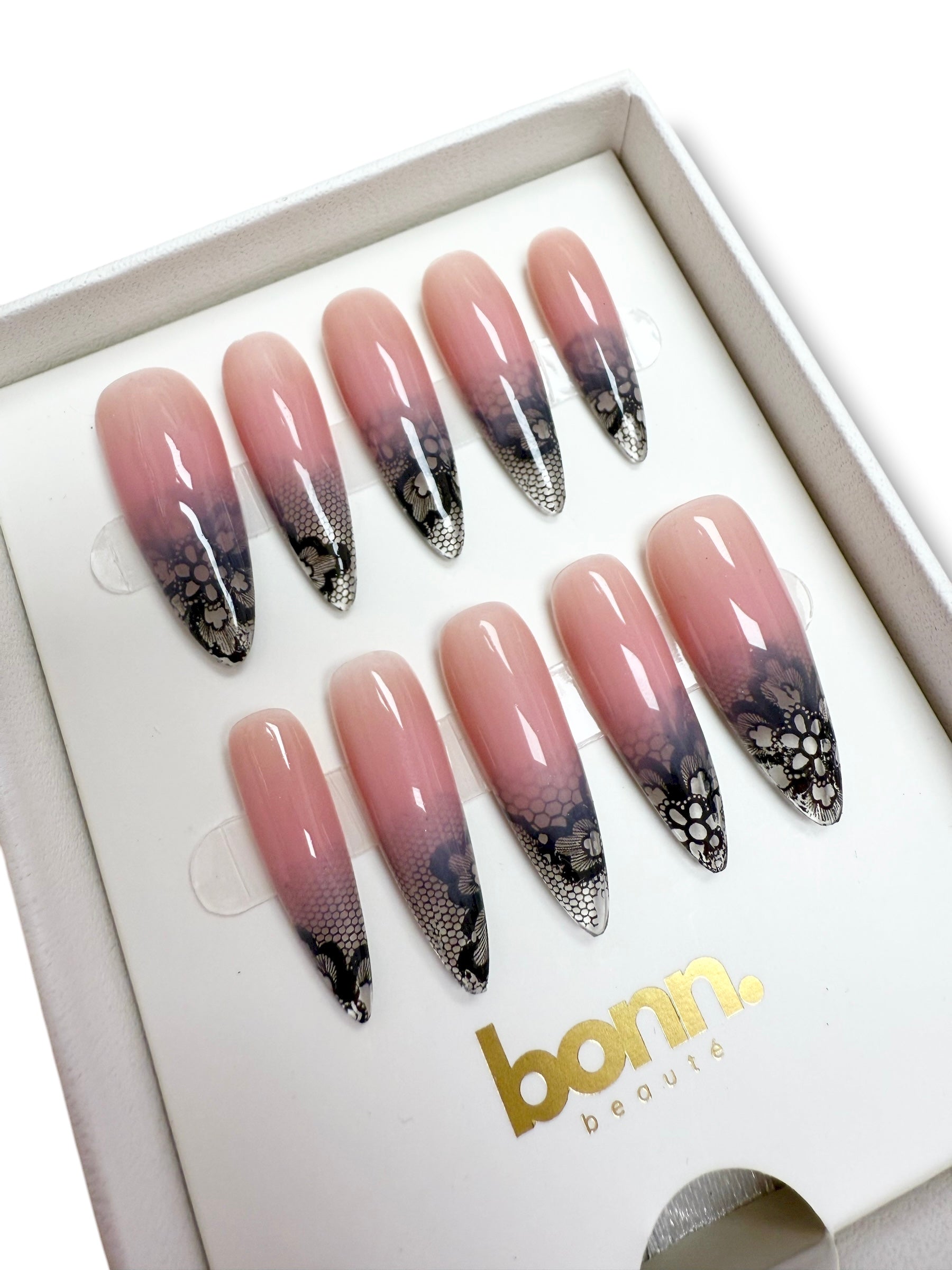 Step into elegance with Midnight Lace, a sultry blend of sophistication and allure. This set features a soft blush nude base that melts seamlessly into jet-black lace tips, detailed with delicate floral patterns and subtle mesh texture. Designed for the modern romantic, Midnight Lace captures the balance between femininity and edge, perfect for evenings out, special occasions, or when you simply want to feel irresistible.