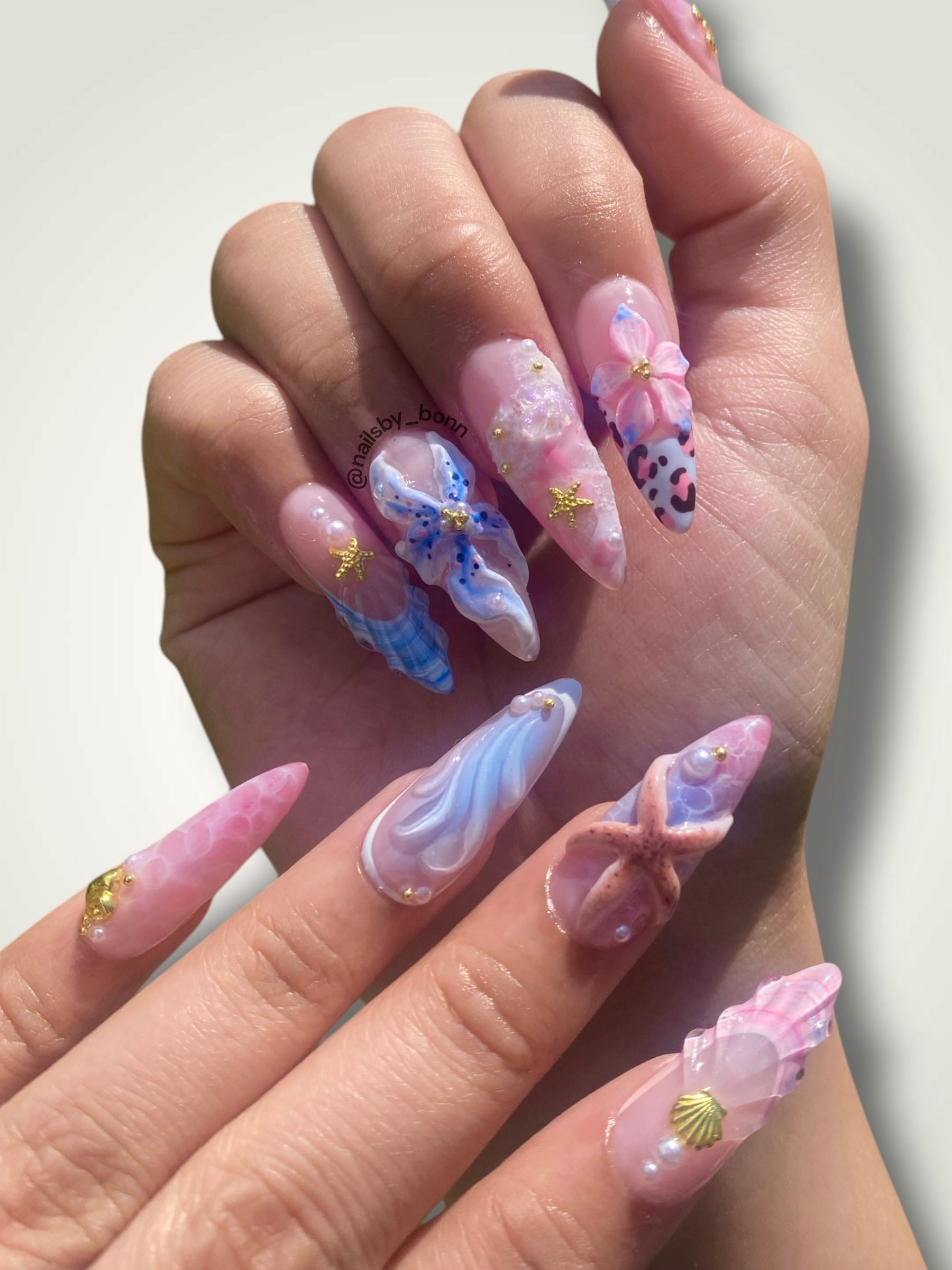 Dive into the deep with Sea Siren — a mystical press-on nail set inspired by ocean waves, sandy shores, and treasures from the sea. Featuring soft pastel hues, 3D sculpted elements like starfish, shells, and pearls, and dreamy swirls of blues and pinks, this set channels pure siren energy.