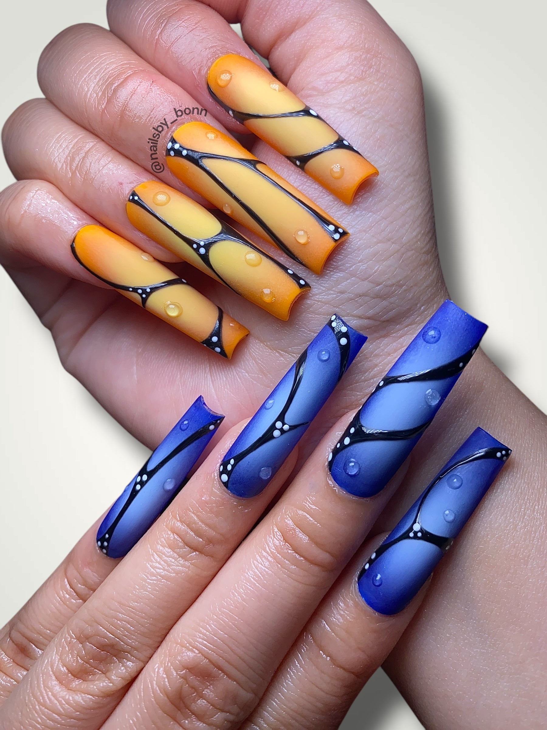 Wings of Dusk is a captivating dual-tone press-on set that brings butterfly-core energy with an edge. Featuring vivid orange-to-yellow and violet-to-indigo ombrés, this design is lined with crisp black accents, dotted highlights, and glossy dew-drop details that mimic morning mist or twilight raindrops. Sleek, matte, and mesmerizing — it’s a statement piece that flies above the rest.